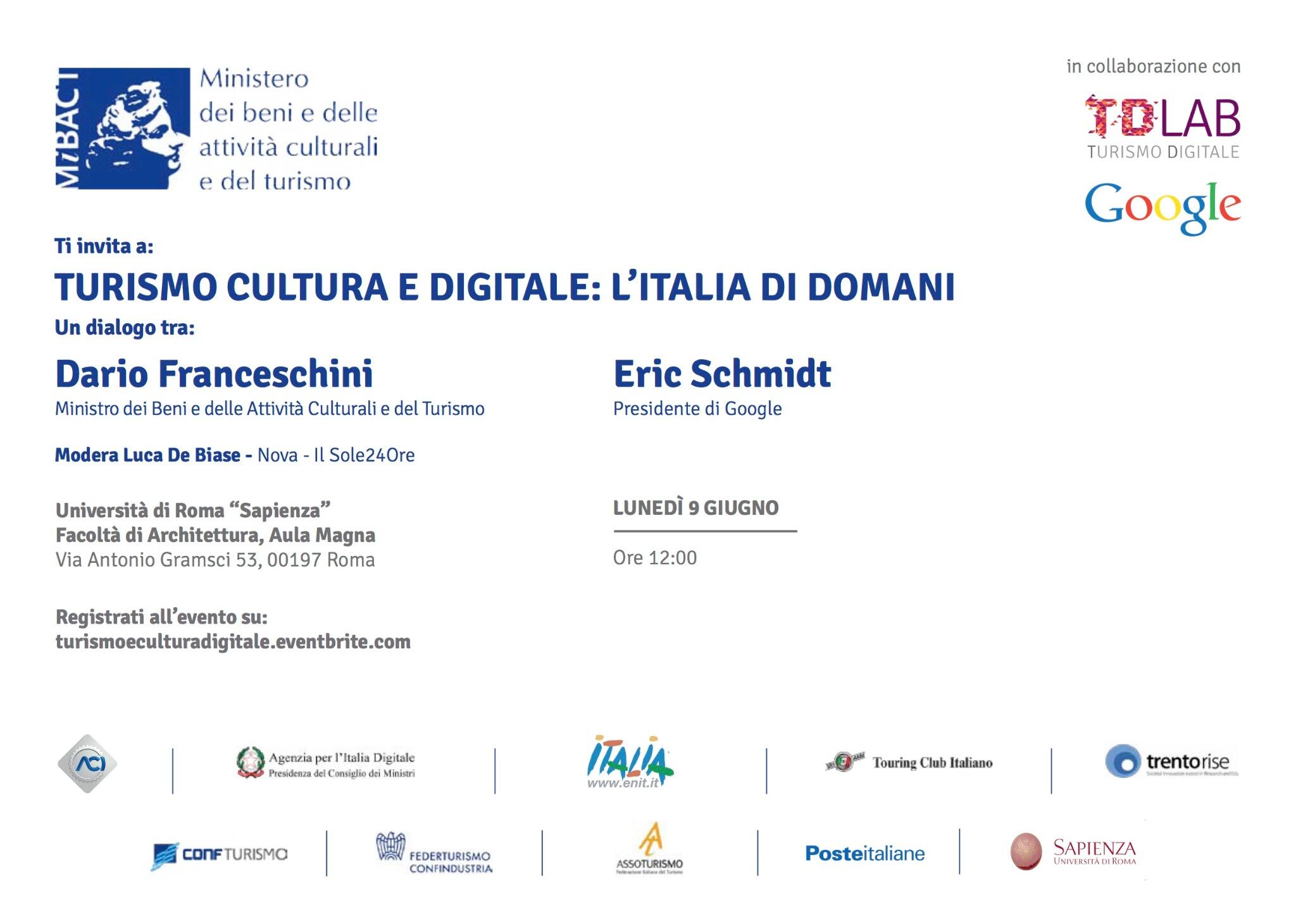 Lunedì prossimo mi troverò in mezzo tra Dario Franceschini, ministro della Cultura, ed Eric Schmidt, presidente di Google. Per un paio d’ore su “Turismo e industria digitale”. L’incontro è spiegato qui.